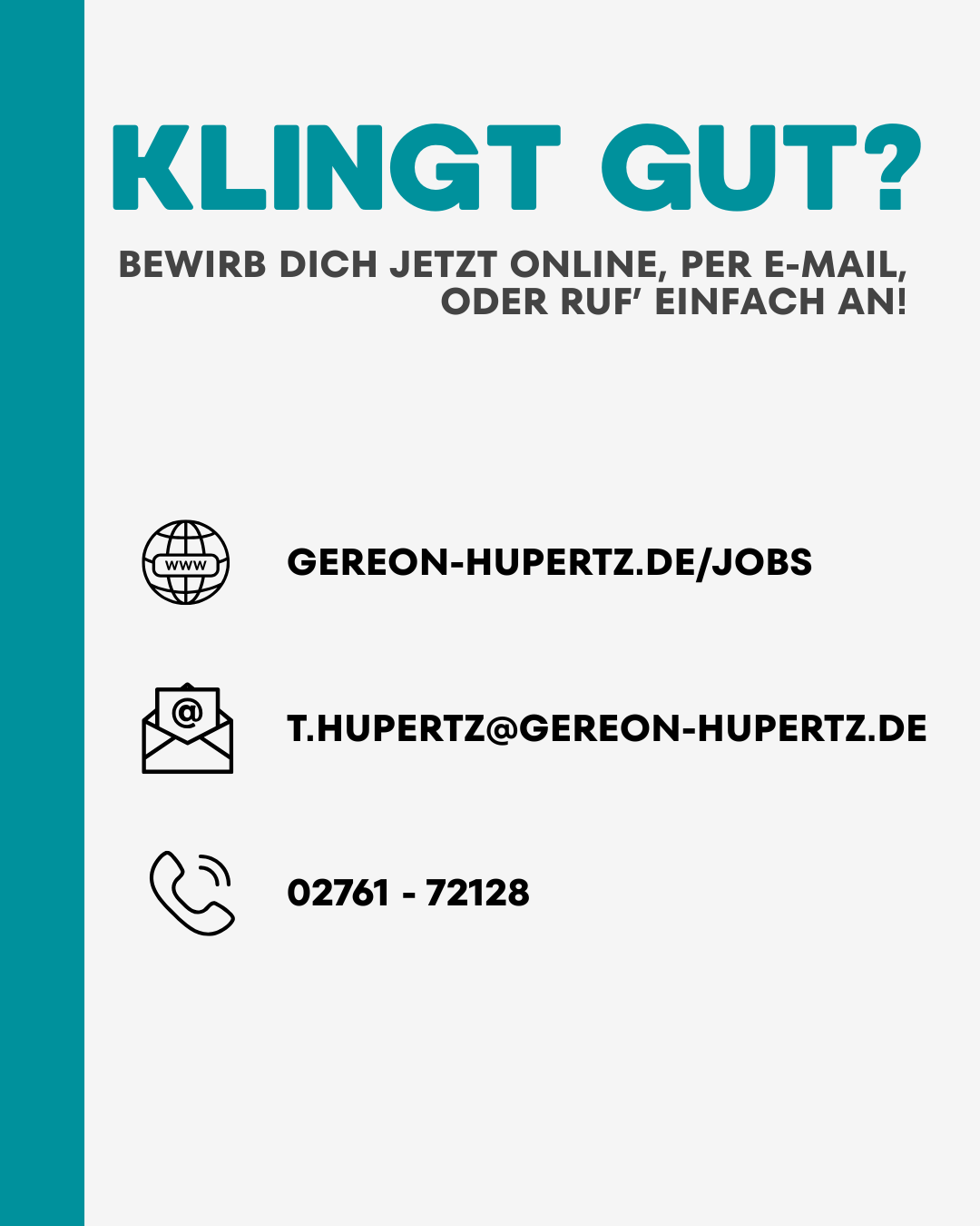 Bewirb dich einfach über das untenstehende Kontaktformular oder per E-Mail an t.hupertz@gereon-hupertz.de!